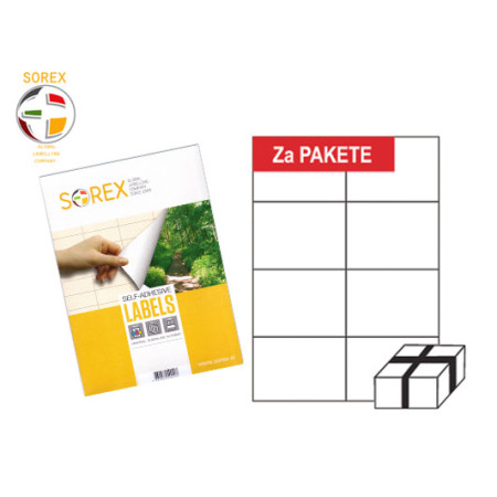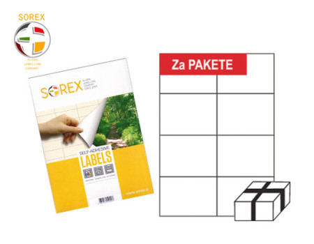 Ετικέτες Sorex αυτοκόλλητες Α4 για εκτυπωτή 105x74mm, συσκευασία 1 πακέτο, 2x4 ετικέτες/φύλλο, 100 φύλλα